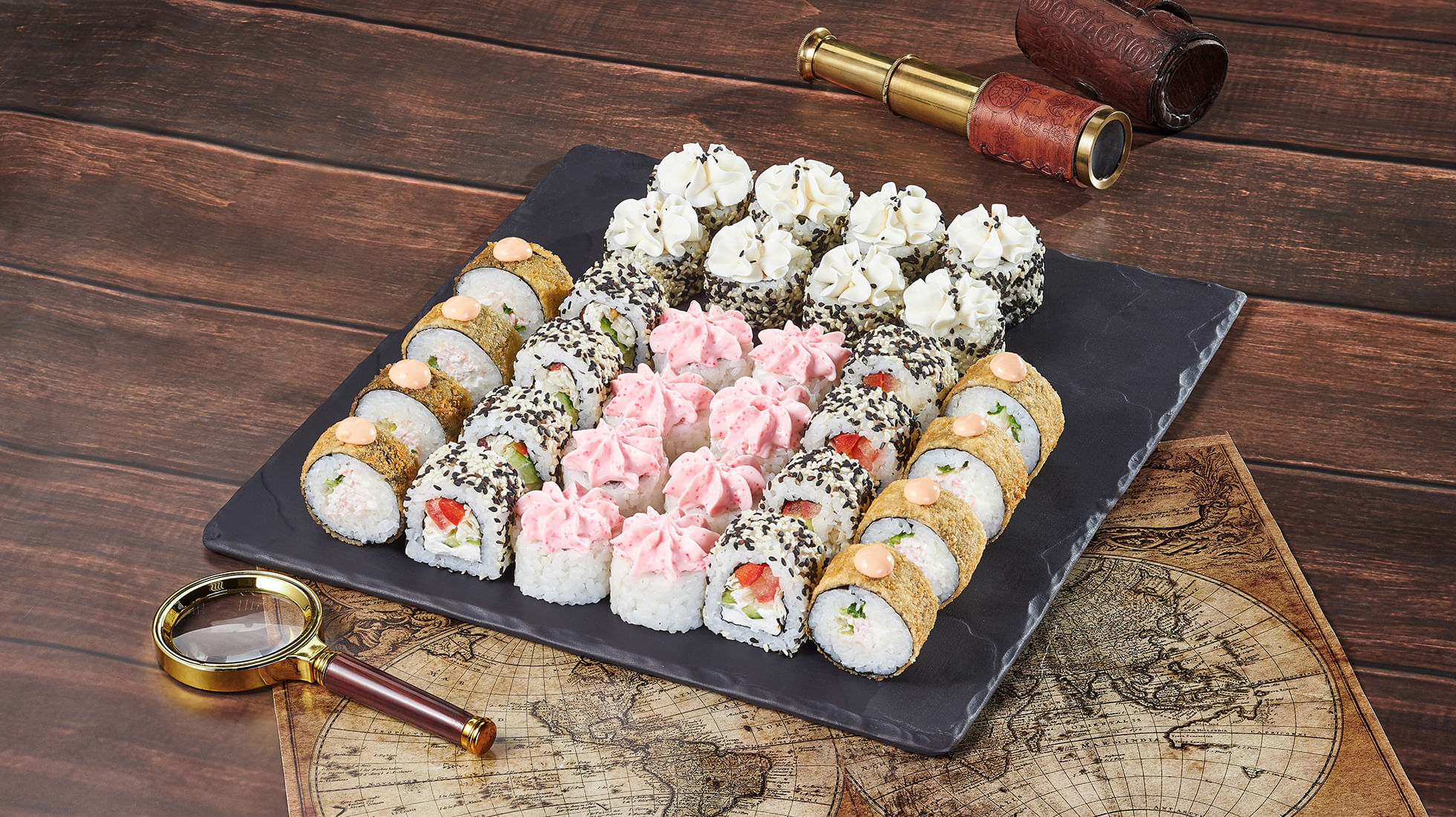 Состав: Ролл Кракатау фреш (8 шт), Ролл Эрта Але (8 шт), Ролл Калифорнийский фреш (8 шт), Ролл Карибы (8 шт) *Не забудьте заказать имбирь, васаби и соевый соус. Они не входят в стоимость заказа. *Внешний вид блюда может отличаться от фото на сайте.